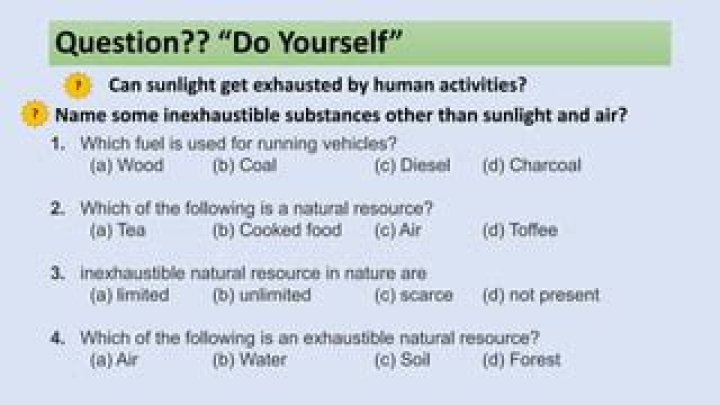 Answer. The natural resources which are present in a limited quantity in nature and can be exhausted (used up) by human activities are called exhaustible natural resources, e.g. coal, petroleum, natural gas, minerals, forests, wildlife, etc.Which of the following Cannot get exhausted by human activities?