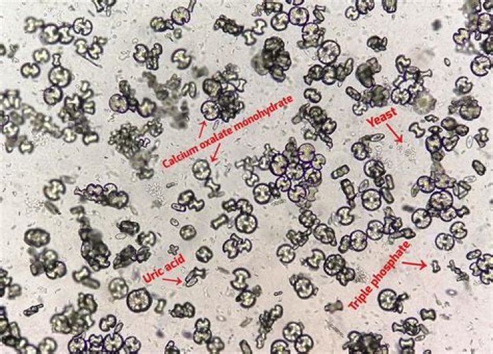 A crystals in urine test looks at the amount, size, and type of crystals in your urine. It's normal to have a few small urine crystals. Larger crystals or specific types of crystals can become kidney stones. Kidney stones are hard, pebble-like substances that can get stuck in the kidneys.Does uric acid make you pee a lot?