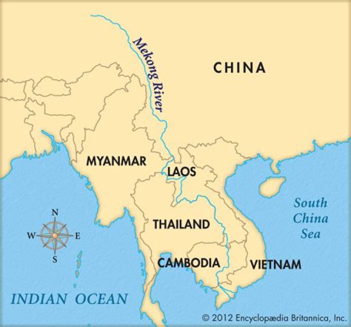 The Mekong's drainage basin covers 795,000 km²23% is located in Thailand, 21% in China, 20% in Cambodia, 8% in Vietnam, and the remaining 3% is in Myanmar.