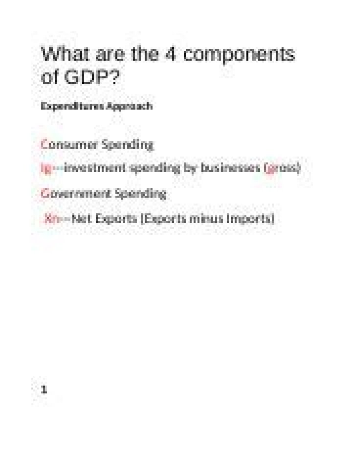 What are the four components of GDP? The four components of GDP are consumption (spending by households), investment (spending by businesses), government spending, and net exports (total exports minus total imports).The 4 Components of GDP
