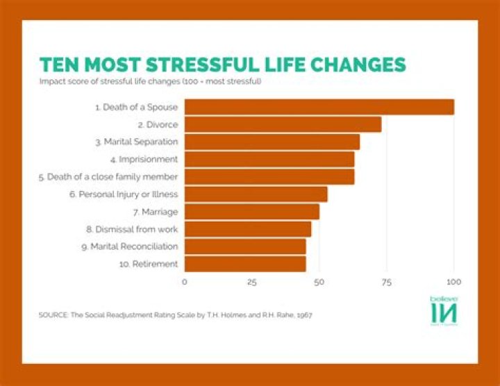 The death of a spouse or other loved one tops the list of the most stressful things we experience. Bereavement affects people in different ways. You may feel shock and sadness, anger or even guilt. You may feel your world has been turned upside down and you don't know how to go on without them.What are the top 20 stressors in life?
