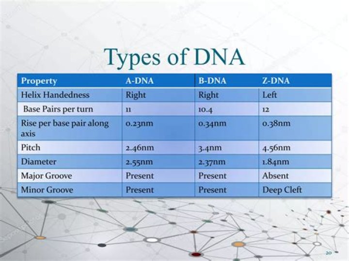 - Z-DNA: Z-DNA is a left-handed DNA where the double helix winds to the left in a zig-zag pattern.