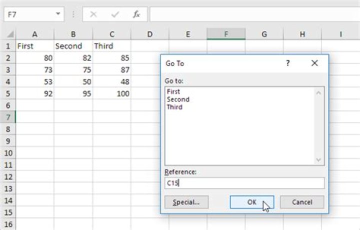 F5 Key. "F5" key displays the "Go To" dialog box. "Go To" box will list down the valid "named range" available in the opened excel workbook. Along with this you can enter the reference of cell where you want to go in the "Reference" text box.Where is F5 key?