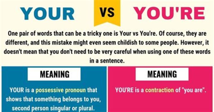 Understanding how to use YOUR and YOU'RE:Your is the second person possessive adjective, used to describe something as belonging to you. Your is always followed by a noun or gerund. You're is the contraction of "you are" and is often followed by the present participle (verb form ending in -ing).