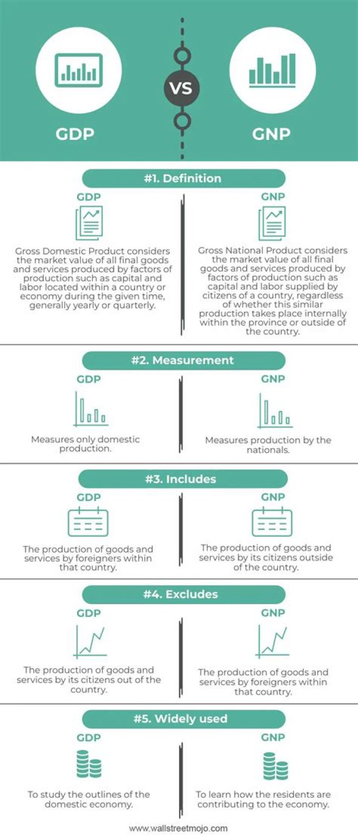 GDP measures the value of goods and services produced within a country's borders, by citizens and non-citizens alike. GNP measures the value of goods and services produced by only a country's citizens but both domestically and abroad. GDP is the most commonly used by global economies.What is GNP and GDP difference?
