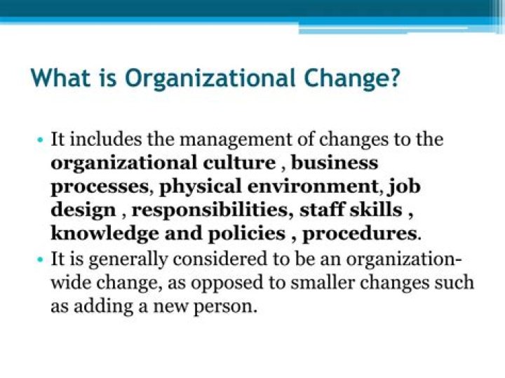 Organizational changes are those that have a significant impact on the organization as a whole. Major shifts to personnel, company goals, service offerings, and operations would all be considered forms of organizational change. It's a broad category.What is organizational change and why is it important?