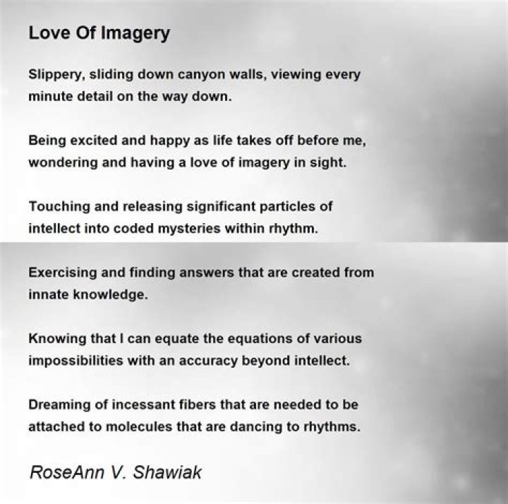 Any poem that uses description to create an image can be called an imagery poem. Poetic images can be evocative of any of the five senses, to encourage readers to imagine the poem's subject vividly. All forms of poetry, not just the rhyming forms, can be vehicles for such imagery.What's another word for imagery?