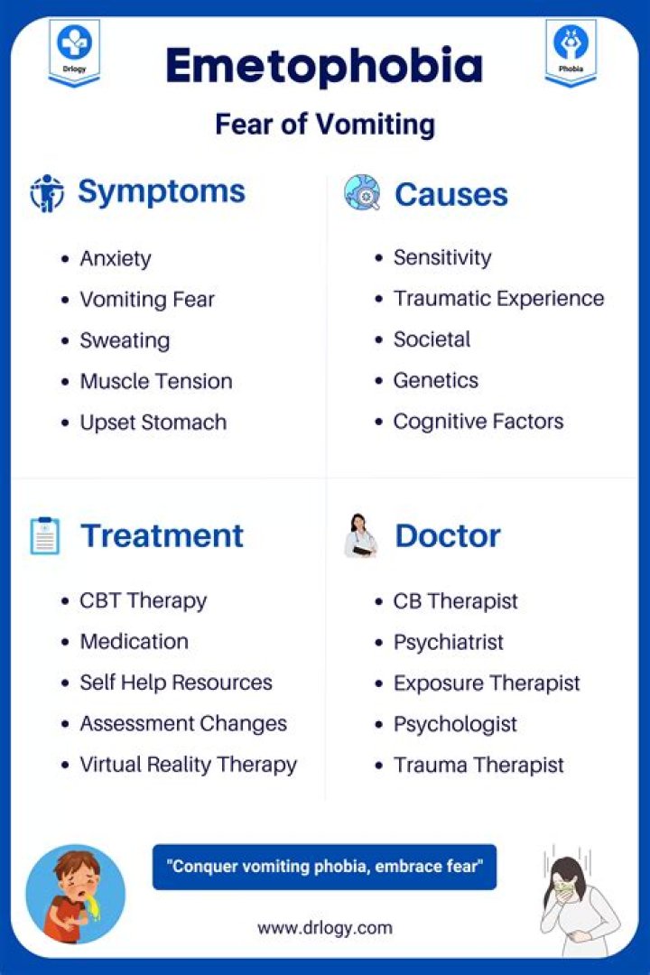 Emetophobia is an intense fear of vomiting or seeing others vomit. It is an anxiety disorder that may occur alongside other mental health conditions, such as generalized anxiety disorder and obsessive-compulsive disorder.Can emetophobia make you throw up?
