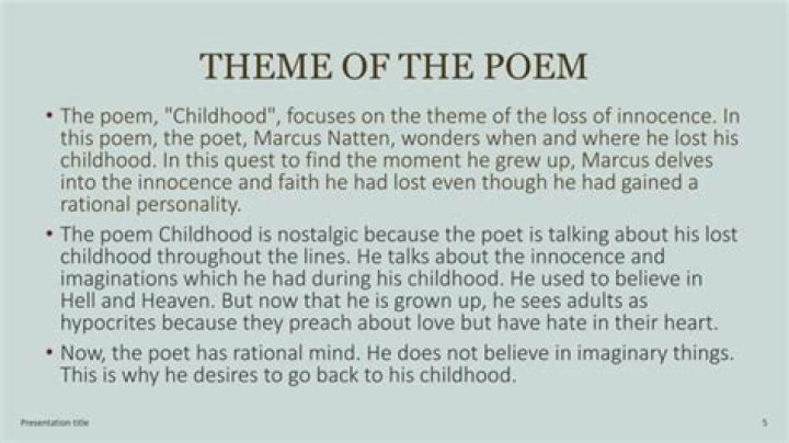 The poem, “Childhood” focuses on the theme of the loss of innocence.In this poem, the poet, Markus Natten wonders when and where he lost his childhood. In this quest to find the moment he grew up, Markus highlights the innocence and faith he lost even as he gained rational individuality.What is the poet's concept of childhood in the poem childhood?