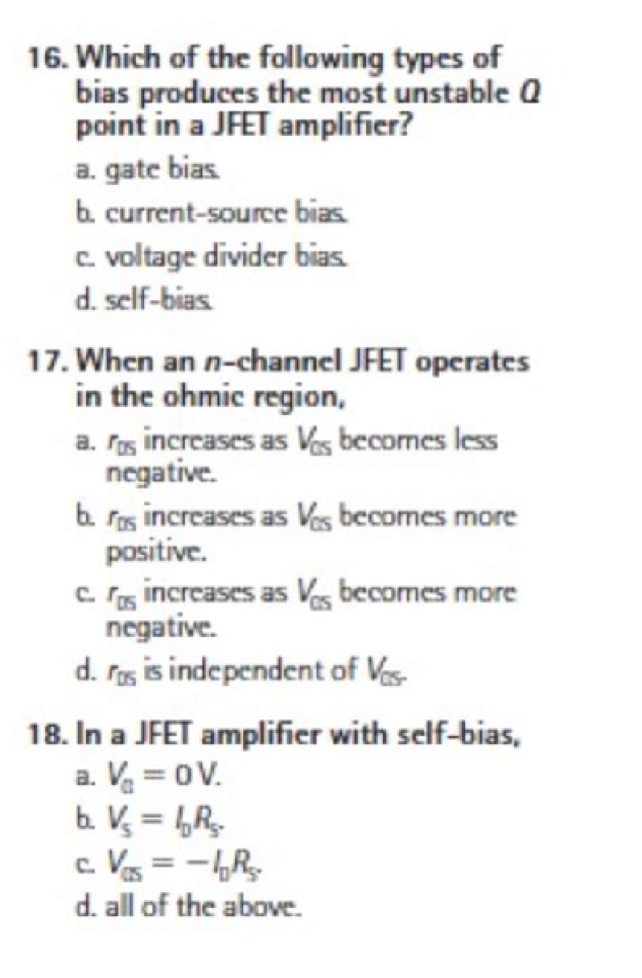 Corresponding to the a.c. plate resistance, we have a.c. drain resistance in a JFET.it may be defined as the ratio of change in drain-source voltage (ΔVDS) to the change in drain current (ΔID) at constant gate gate-source voltage i.e. b. Transconductance.What are the three basic operating characteristics of JFET?