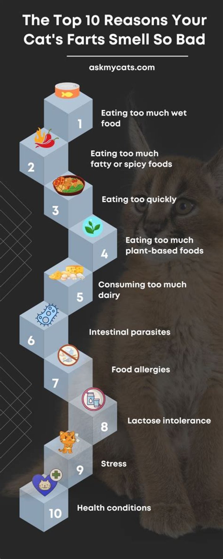 Food allergies or a dietary intolerance, which can happen at any time in a cat's life. Cat illnesses, like hyperthyroidism, colitis, inflammatory bowel disease, or cancer. Parasites, such as roundworms, which are a common issue for cats.Why does my cat smell like rotten eggs?